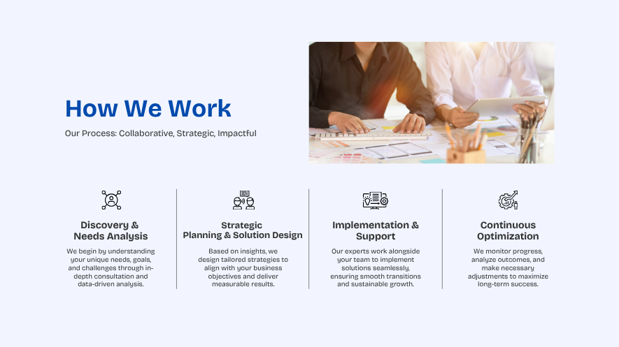 Discovery & Analysis → Strategic Planning & Solution Design → Implementation & Support → Continuous Optimization