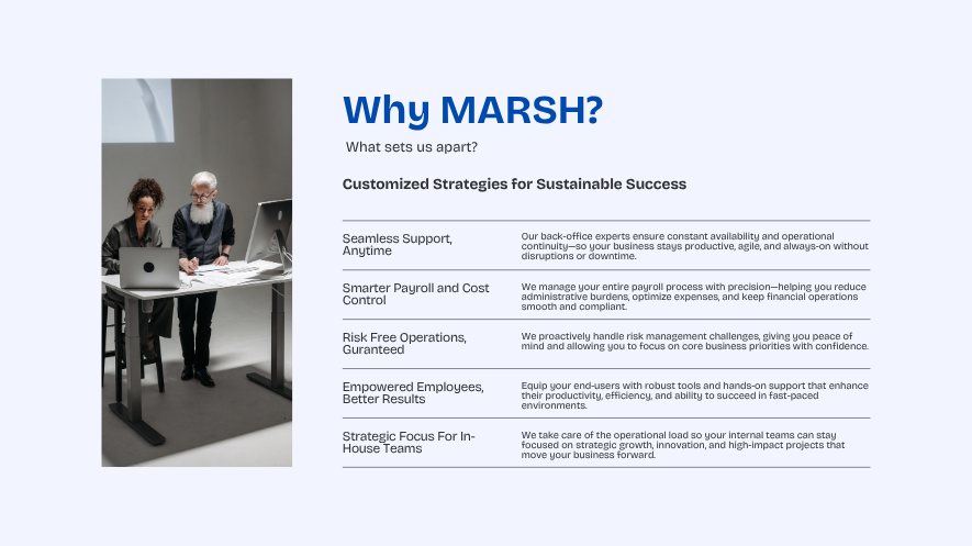 MARSH Services & Outsourcing is a talent and business solutions provider specializing in recruitment, managed services, payroll management, IT services and managed staffing. We empower business to scale efficiently by delivering tailored support, expert talent, and seamless operational execution – enabling our clients to focus on growth, innovation, and strategic priorities.