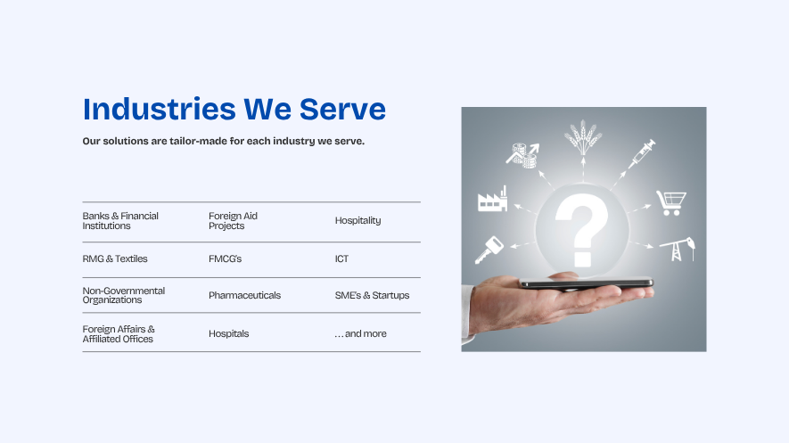 Banks & NBFI | RMG | Hospitality | Education | NGO | Pharma | SME & Startup | And many more…